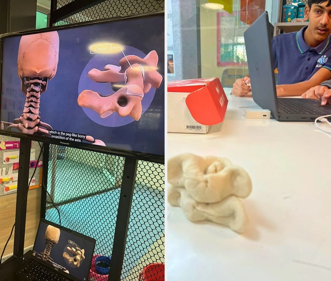 Under the theme of Biomimicry, Year 8 learners explored the atlanto-axial joint by understanding the structure, function, and working mechanism of the cervical bones and ligaments. They brought this learning to life by creating a robotic mimic of the joint using the robotics module, successfully replicating the smooth rotational articulation of the neck through technology and design.