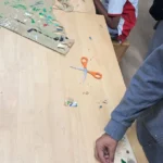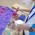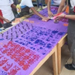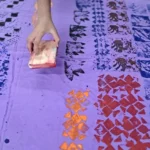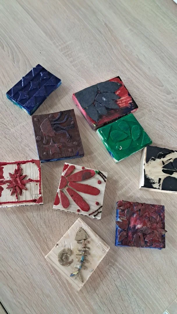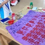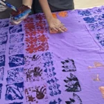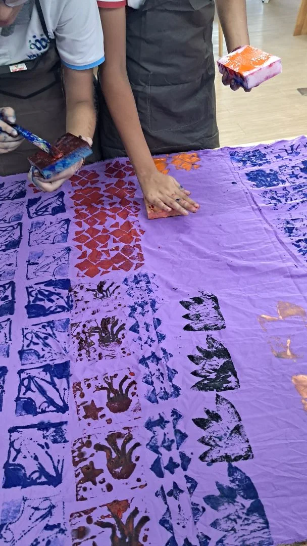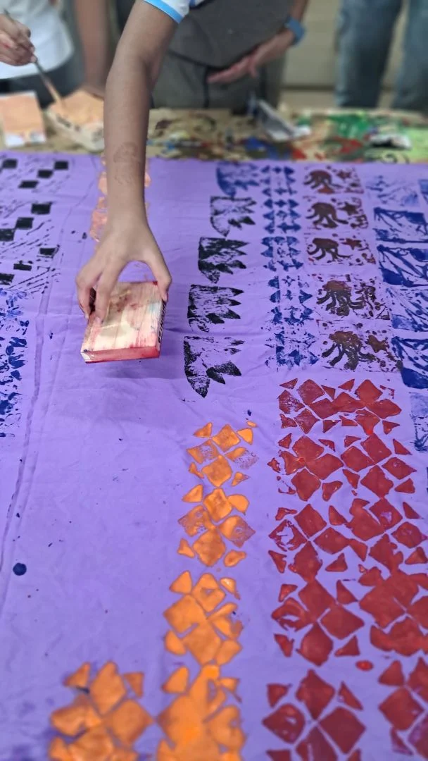 Using pieces of wood as bases and layering cardboard and string to form unique patterns, learners discovered how texture and relief influence the final print. In this stage, they experimented with printing their handmade blocks on fabric, observing how pressure, color, and surface texture affect their designs.